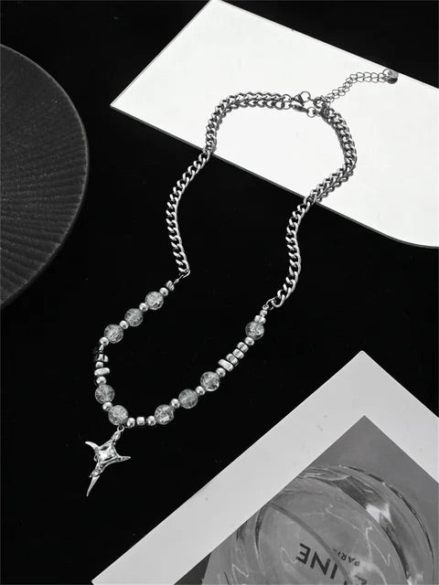 The Celestial Eternity Pearl Chain Necklace exudes a timeless elegance with its pearl and chain twisted design. Expertly crafted with a star shaped pendant, it comes uniquely designed for versatile wear. Elevate your style and add a touch of celestial charm to any outfit.