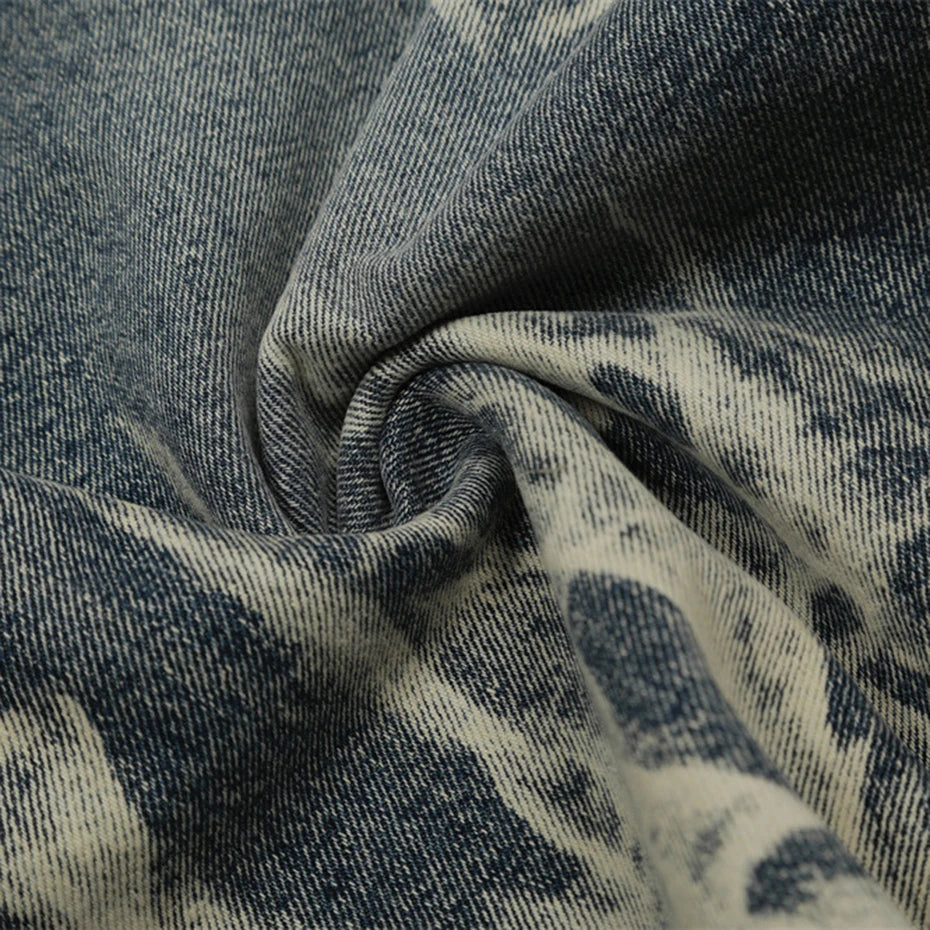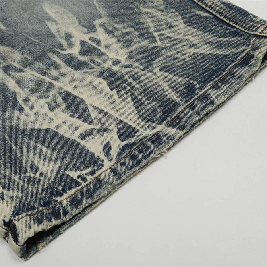 Ignite your style with the Flame Wash Denim Shorts, a fiery statement piece that brings an unmissable edge to your warm-weather wardrobe. These unique jorts feature a captivating, all-over print that mimics the dynamic lick of flames or abstract lightning, starting from the hem and ascending upwards in a striking contrast against the faded blue denim.