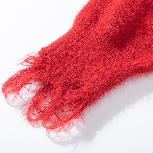 Join the purrfectly playful pack with the Kitty Crew Sweater, a whimsical piece that adds a touch of feline charm to your wardrobe. This delightful sweater features a trio of black cats playfully positioned against a vibrant red backdrop, creating a striking contrast that's sure to catch the eye. The distressed detailing around the neckline, cuffs, and hem adds a touch of edgy character, balancing the sweetness of the cat motif.
