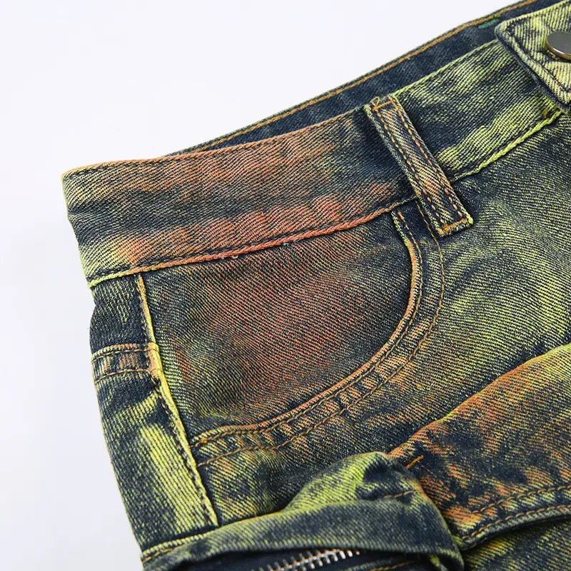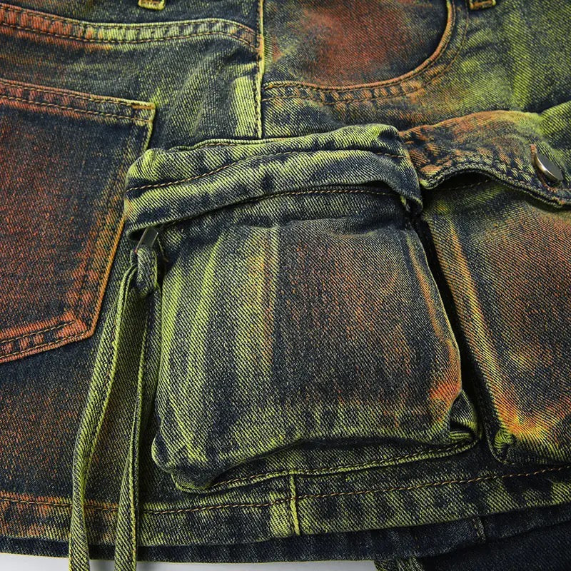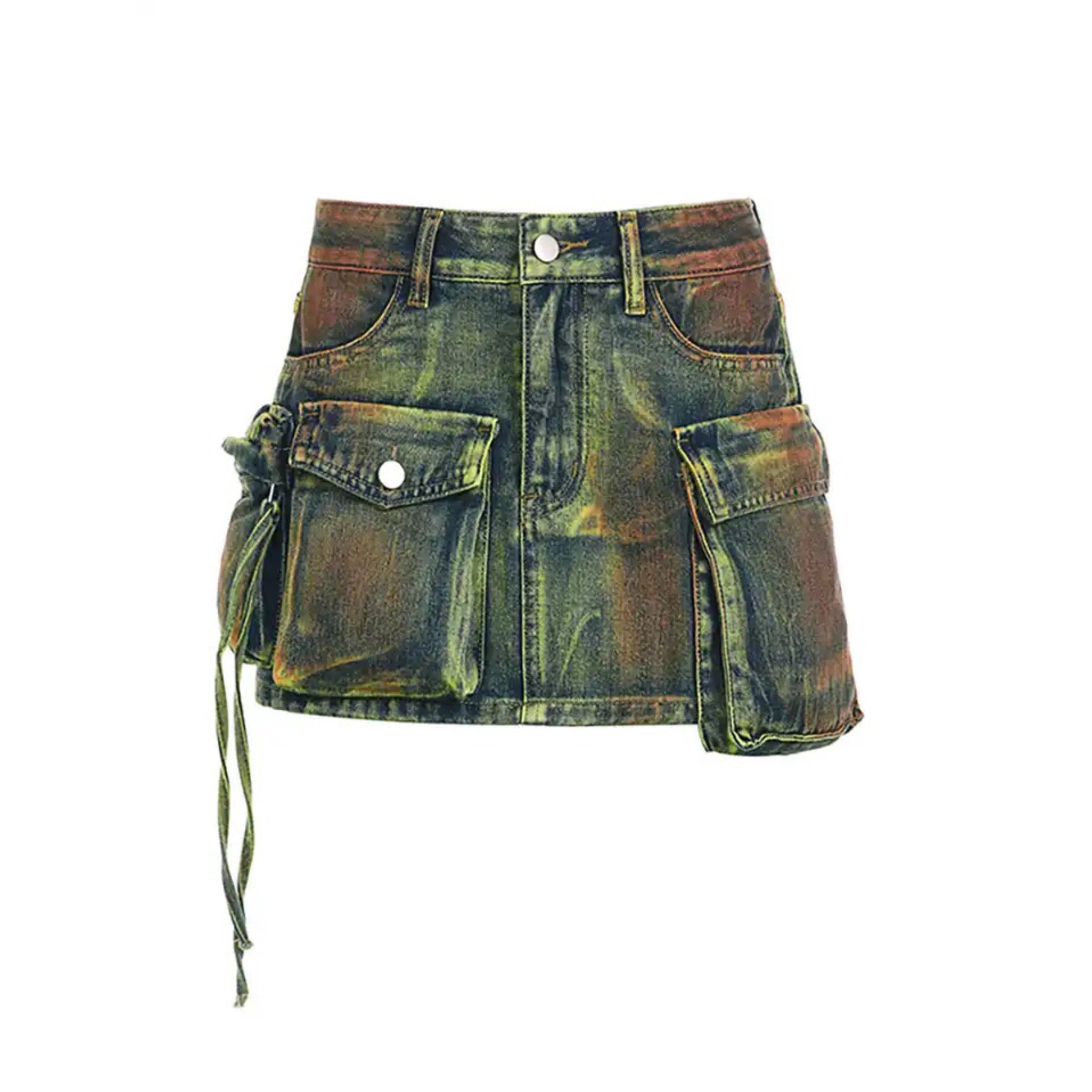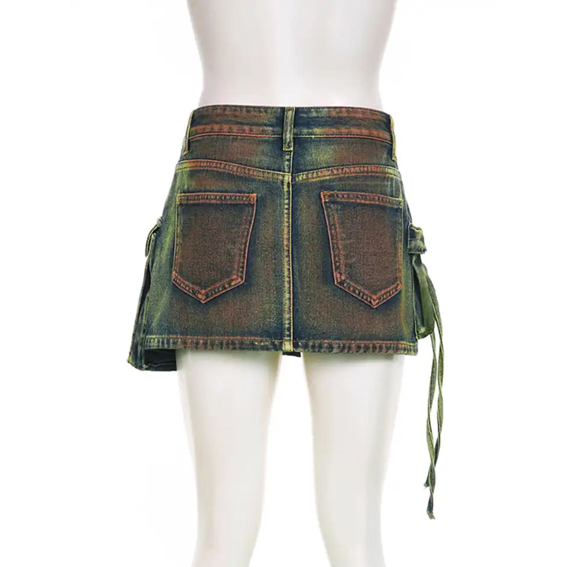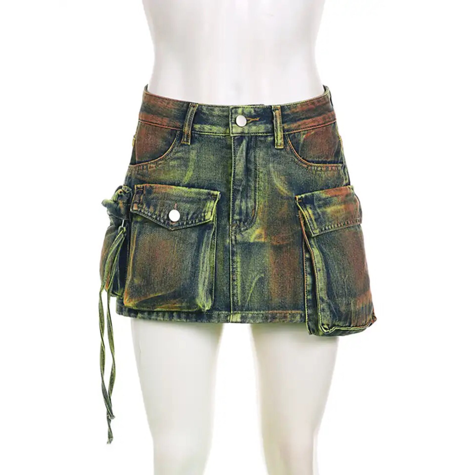 Introducing our Tassel Pocket Denim Skirt. Crafted with a lush green hue and accented with multiple pockets, this skirt is a luxurious addition to your wardrobe. With its unique tassel detailing, this piece is both practical and stylish, making it a must-have for any fashion-forward individual. Elevate your ensemble with this exclusive skirt.