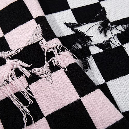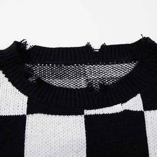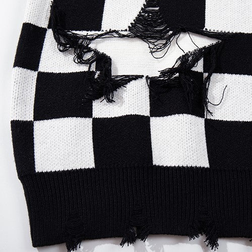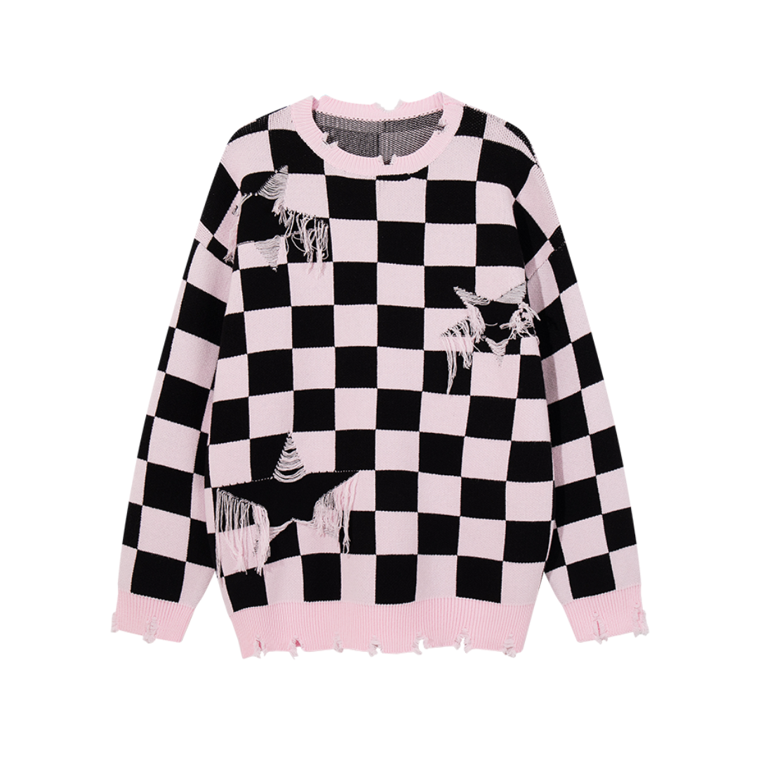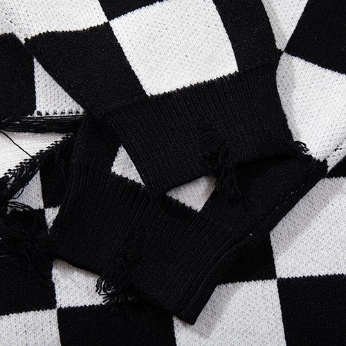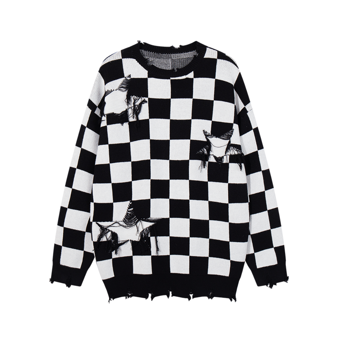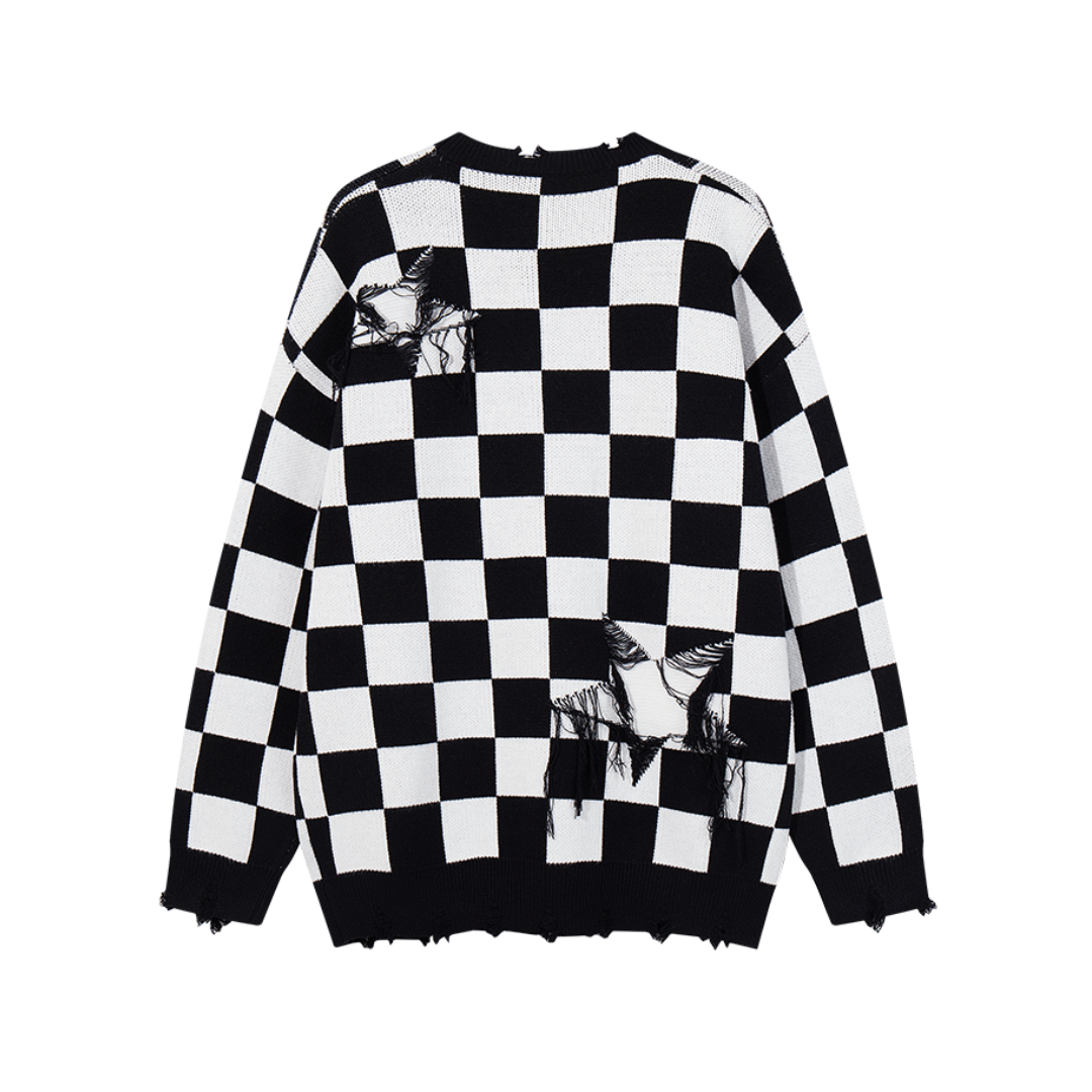 Embrace the edge with the "Torn Check Distressed Sweater," a statement piece that blends style with a touch of rebellion. This captivating sweater features a bold checkerboard pattern, creating a look that's both edgy and intriguing. The distressed detailing adds a touch of rebellion, giving the sweater a unique and individualistic feel.