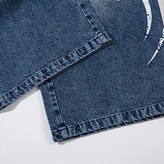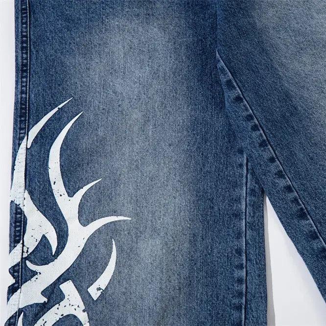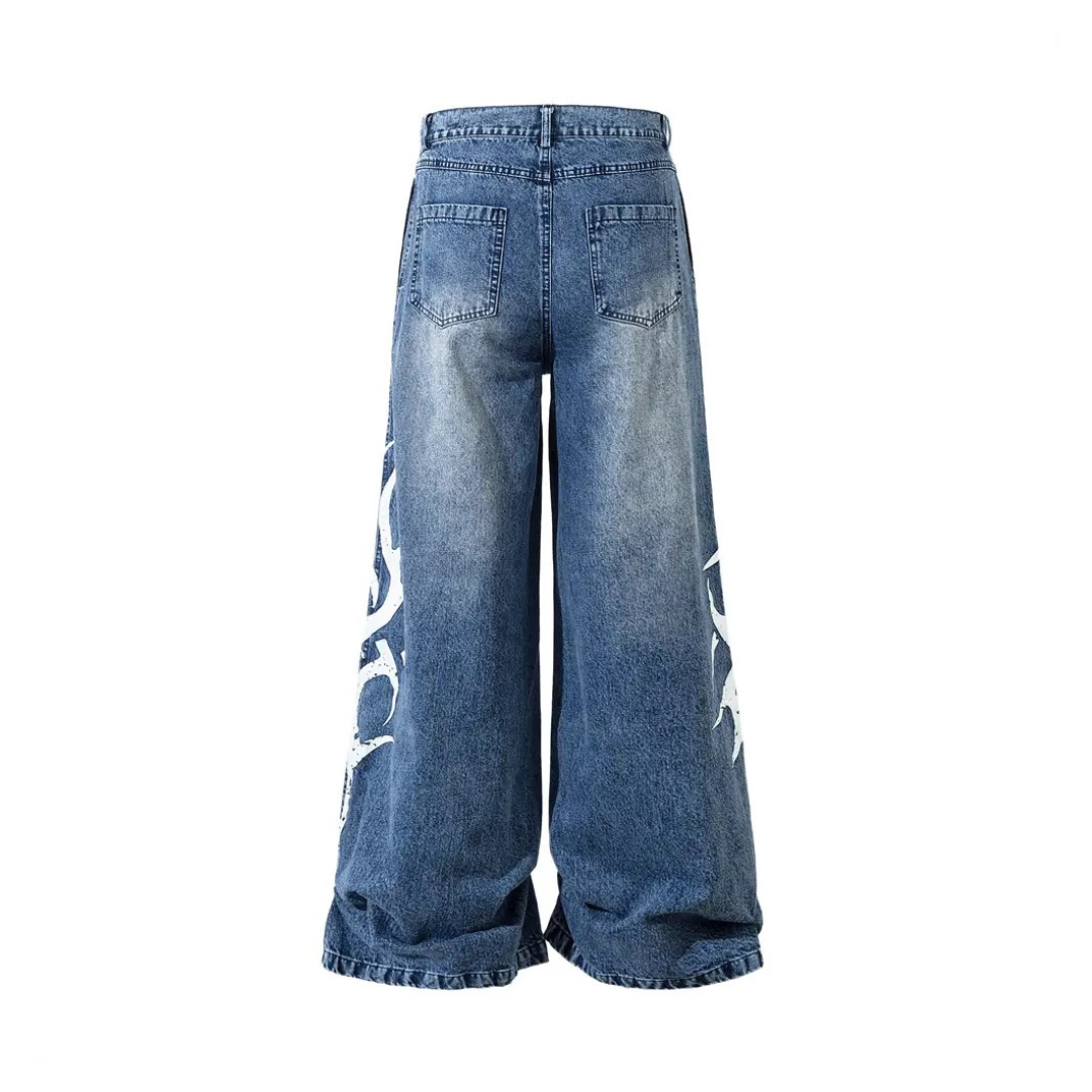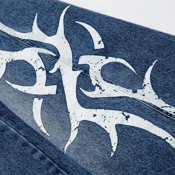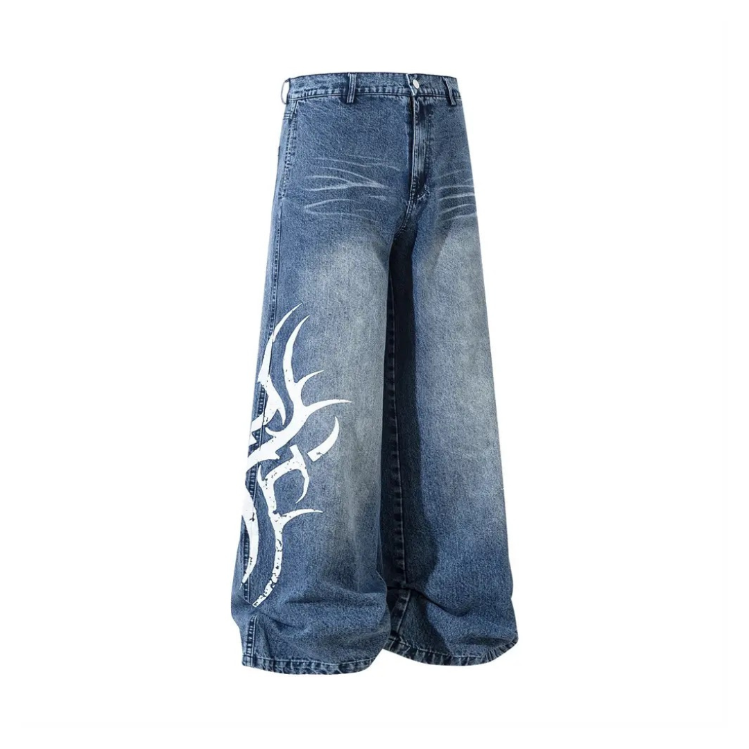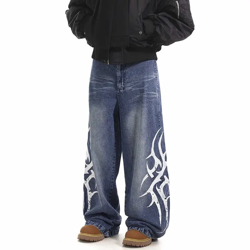 These jeans are a bold statement piece with a unique blend of Y2K and streetwear styles. The wide-leg silhouette and low-rise waistline are reminiscent of early 2000s fashion, while the tribal tattoo-inspired print adds a modern edge. The faded wash and distressed details give the jeans a vintage feel, creating a perfect balance between old and new.