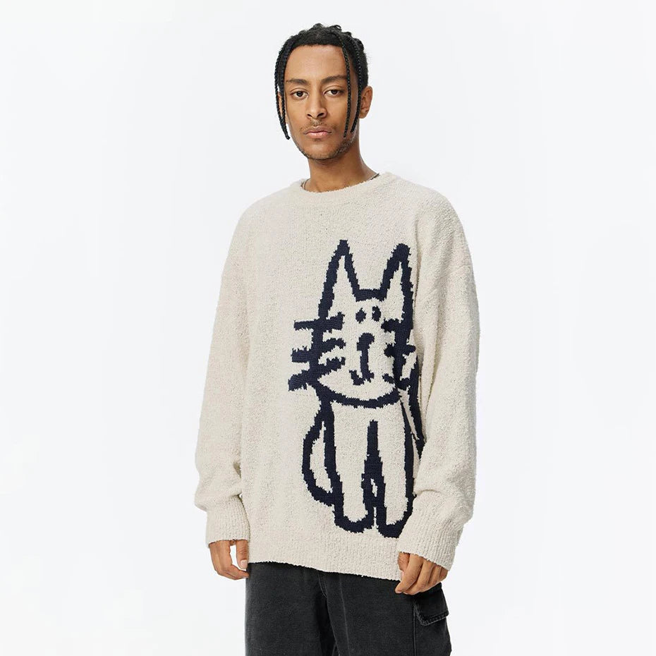 Upgrade your comfort with the Fuzzy Script Crew Sweater. This cozy, off-white knit features a unique hand-drawn cat graphic, adding an abstract streetwear statement. The soft, textured material ensures both warmth and effortless style, making it the perfect piece for layering or standalone wear.